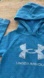 UA boy’s size small hoodie. Pullover features a 67/20/13 cotton/poly/rec poly blend dusty blue fleece material; brushed interior; raglan sleeves with ribbed cuffs; even ribbed hem; kangaroo pocket; attached hoodie; and signature light gray speckled big word/symbol logo across chest. Light, comfy and super soft! Perfect for active or casual wear! Great preloved condition. Refer to pictures for measurements.