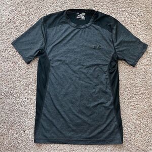 Under Armour T Shirt. Mens size small. Short sleeve. Athletic colorblock look with black and dark charcoal gray. In excellent condition! Care tag has been cut out.