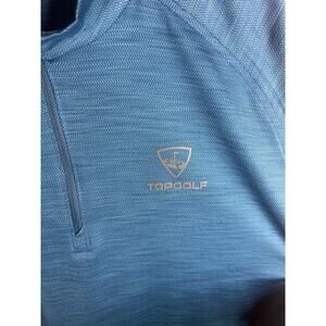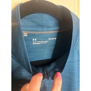 Elevate your activewear game with this Under Armour TOP GOLF men's half zip long sleeve shirt. The bluish color and solid pattern make it a versatile addition to any wardrobe. The shirt features a mock neck and pullover closure, with a 1/4 zip and quarter zip for added style. Crafted from microfiber fabric, this shirt is machine washable with a medium fabric wash. The loose fit and mild compression level ensure comfort during any activity, whether it be cycling, golf, baseball, cross training, dance, driving, crossfit, basketball, or bodybuilding. The shirt is a size L and is perfect for any man who wants to look and feel great during their workout routine.