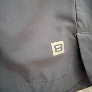 Shorts: Black, elastic waistband, quick-dry performance fabric (86% polyester, 14% spandex)