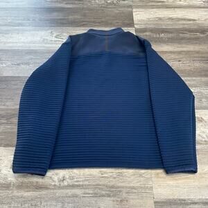 In good pre-owned condition, piled and stained back and sleeve, lightweight, 100% polyester, long sleeve, mock neck, chest logo, cozy, pullover, sporty, golfer.