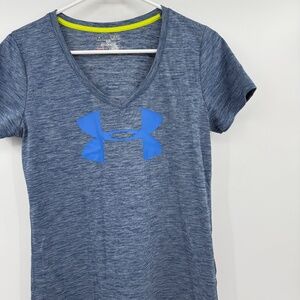 Under Armour Top Women Small Blue Short Sleeve Heatgear V Neck Logo Performance