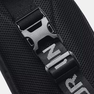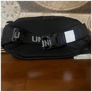 Adjustable webbing strap with elastic & clip closure that can be worn as a waist bag or a crossbody sling