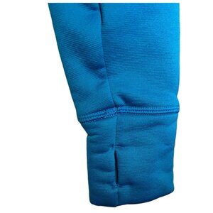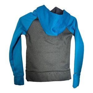 Excellent pre owned condition. No holes or stains. Had front pocket and thumb holes. Unisex Grey and teal in color.