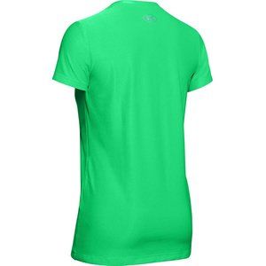 This women's Under Armour HeatGear UA Tech V-neck t-shirt is size XS and NWT! The ultra-soft 90% polyester and 10% Spandex UA Tech stretch fabric with mesh texture is quick-drying, has anti-odor technology, and is solid green with silver accents. This loose fit short sleeve t-shirt features a deep V-neck, anti-odor control, and UA logos on the left chest and top back.