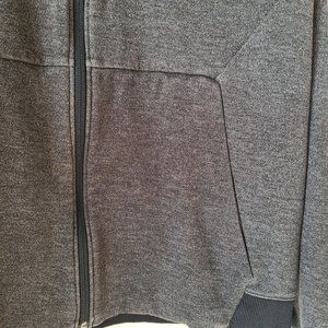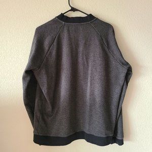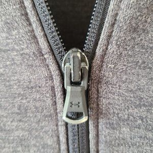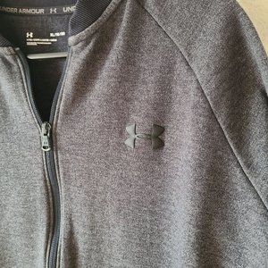 Good used condition US men's size XL Under Armour fitted double knit bomber-style full-zip jacket in gray/black colorway. Some light wash wear. Some wear to zipper is photographed for review. No major flaws to note. Approximate measurements provided in photos for fit.