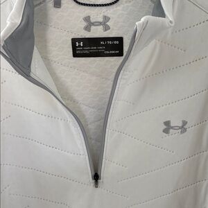 Under Armour pullover with quarter-zip design. Features white and gray colors. Ideal for cold weather.