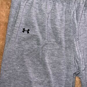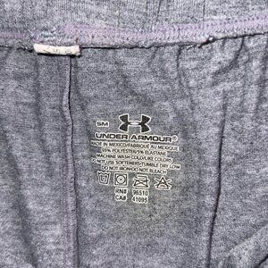 Step into comfort and style with these sleek Under Armour Women's Capri pants, a perfect blend of fashion and functionality designed for the active lifestyle. These size small capris feature a versatile heather gray color accented by a subtle black trim. The elastic waistband provides a snug, comfortable fit, while the drawstring ensures adjustability for your convenience. Crafted from a soft, breathable fabric that moves with you, these capris are ideal for workouts, casual outings, or relaxing at home. The iconic Under Armour logo is tastefully displayed, adding a touch of sporty elegance to your look. Whether you're hitting the gym or running errands, these capris are sure to be a go-to in your wardrobe.