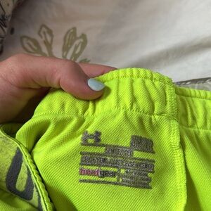 Bold lime shorts with comfortable fit. Ideal for sports and leisure. Features Under Armour branding.