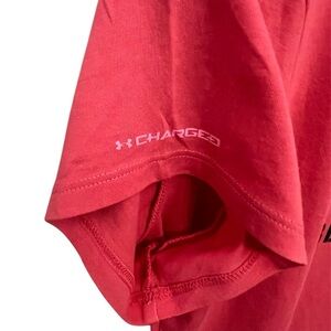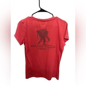 Vibrant coral tee with 'Believe in Heroes' print. Ideal for casual wear or workouts. Soft and comfortable fabric.