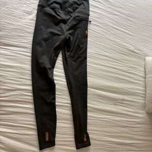Experience the perfect blend of style and performance with these Under Armour leggings, featuring a sleek black base and vibrant orange stripes. Designed for both workouts and casual wear, these full-length leggings offer a flattering fit and dynamic design. Crafted from stretchy athletic material, they ensure comfort and flexibility for any activity. Leggings in excellent condition.