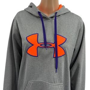 Under Armour UA Storm gray semi fitted sweatshirt. Orange logo and orange inner hood. Purple drawcords and logo outline. Hooded. Pulls on. Long sleeves. Polyester. Machine wash. 1232476. In preowned condition.