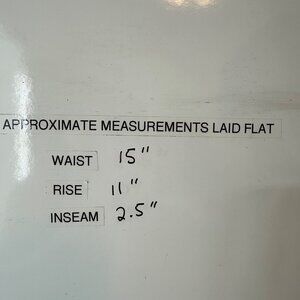 Waist = 15 inches, Rise = 11 inches, Inseam = 2.5 inches.