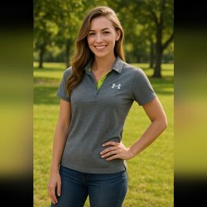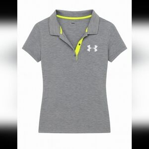 This women's size medium Under Armour polo shirt is perfect for a sporty or casual look. The shirt is a classic gray with a vibrant, neon yellow-green accent on the inside of the collar and placket, adding a pop of color. The iconic Under Armour logo is embroidered on the chest.
