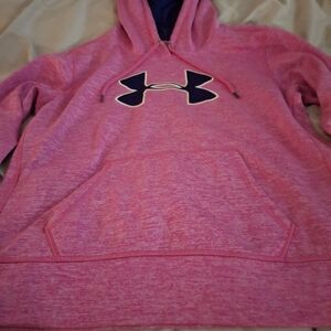 Under Armour women's Cozy heathered pink hoodie sweatshirt with a navy logo. Features a kangaroo pocket and adjustable hood. Size Large. pit to pit measures 22 inches. Length 26 inches.