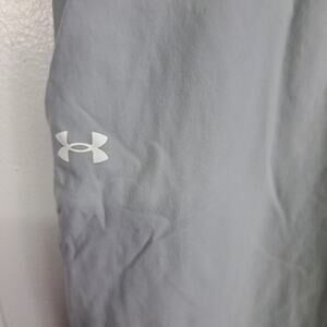 Under Armour women’s jogger pants in a light gray color, size XS. Designed for comfort with a soft and lightweight stretch fabric, ribbed drawstring waistband, and tapered legs. Features the Under Armour logo on the front pocket area.