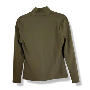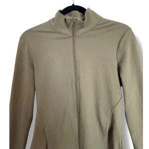 This Under Armour Motion Jacket is a women’s size medium in olive green. It has a fitted style with a full zip front and side pockets. Made with lightweight stretch fabric, it’s comfortable for workouts, casual wear, or layering. Sleek and stretchy.