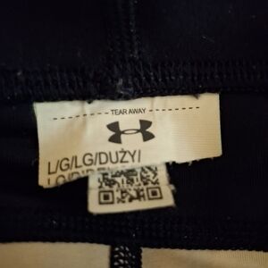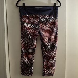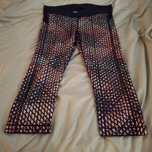 Under Armour women's Dynamic leggings with a bold geometric design. Perfect for active play. Comfortable fit. Size Large. waist side to side measures 15 inches with stretch. Length 28 inches.