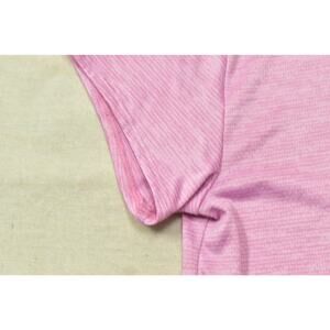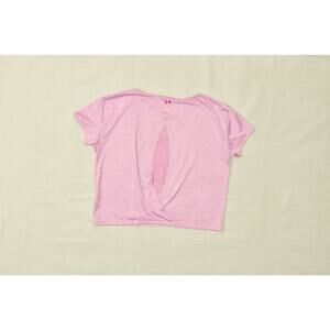 Stay cool and comfortable during your workouts with this Under Armour Women's Regular Size L pink striped athletic T-shirt. This versatile tee features a subtle heathered pink and white striped pattern, adding a touch of style to your activewear. The unique open back design provides enhanced breathability and a fashionable detail, making it perfect for intense training sessions or a casual look. Made from a blend of 96% polyester and 4% elastane, it offers a soft feel, quick-drying properties, and comfortable stretch. The Under Armour logo is subtly featured on the upper back. Ideal for the gym, yoga, or everyday athleisure, combining performance features with a modern design.