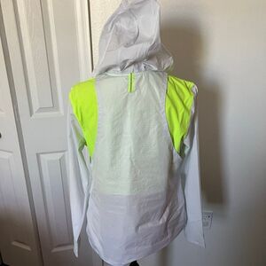 This listing. Is for a NWT's Under Armour Women's 'Run Anywhere' Anorack Windbreaker Jacket in size medium. The jacket has 1/4 zip, and is white with neon green.
