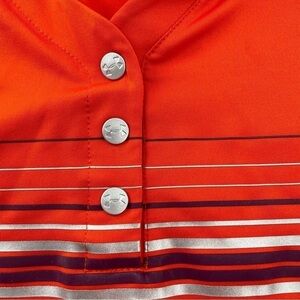 Under Armour Women's SS Orange Auburn Tigers Solid Golf Polo Loose Heat Gear On the field Short Sleeve Polo. V neck collared snap front. White color block with navy blue and sliver stripe. Student athlete issued golf polo. In excellent barely worn if ever condition.