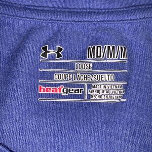 Elevate your activewear with this Under Armour HeatGear T-shirt in a vibrant blue color. The lightweight, breathable fabric with medium wash is perfect for all seasons and activities, from tennis to hiking. The pullover style with crew neckline and short casual sleeves provide a comfortable fit, while the athletic loose fit ensures freedom of movement. Ideal for travel, casual wear or sports, this T-shirt boasts a versatile style, making it a must-have addition to your wardrobe. The solid pattern and Under Armour brand add a touch of athleisure and sports-themed flair. Machine washable for easy care, this T-shirt is in excellent used condition and is ready to join you in your next adventure.