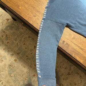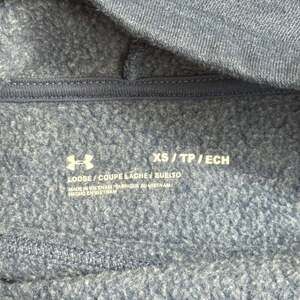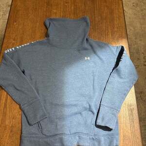 Under Armour Women's UA Taped Fleece Funnel Neck Sweatshirt in blue. This sweatshirt features a stylish funnel neck, fleece lining for warmth and comfort, and "Under Armour" taping detail along the sleeves. Excellent pre-owned condition, no stains or holes. Perfect for athletic wear or casual everyday comfort.