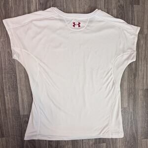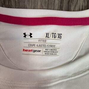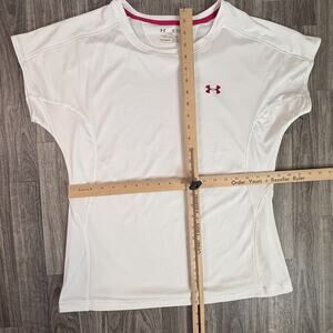Under Armour HeatGear performance tee in white with pink accent and logo. Fitted, lightweight, moisture-wicking, stretchy for athletic use. Clean condition with normal minimal wear. Ideal for workouts, running, gym, training, yoga, layering. Please check photos carefully for any minor wear or marks.