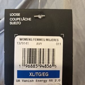 This is a brand new with tags (NWT) Under Armour Women's Rush Vanish Energy short sleeve t-shirt. The shirt is a light grey color and a size XL/TG/EG. This style is designed with UA Rush technology, which is infused with minerals to absorb your body's energy and reflect it back to improve endurance. The fabric is a soft, breathable material, and the shirt has a comfortable, loose fit. Perfect for workouts, running, or casual wear. The style number is 1379141 and the color code is 011. The shirt is made of 90% polyester and 10% elastane.