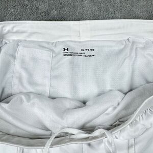 Under Armour men’s XL white HeatGear athletic shorts. Features elastic waistband with drawstring, mesh-lined interior, breathable side panels, and side pockets. Lightweight, quick-dry fabric for gym, training, or casual wear.