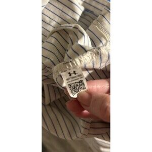 The product is an Under Armour Womens Zinger Stripe Golf Polo Sleeveless Shirt, specifically designed for golfing. It features a collared neckline, pullover closure, front 1/4 buttons and is made from a lightweight and breathable blended fabric. The shirt is in a size M and has a stylish Zinger Stripe pattern in blue color, perfect for summer, fall, and spring seasons. Please look at pictures as there is a very small tear on top of the collar. With its athletic fit and polyester blend material, this shirt offers comfort and performance for active women golfers. Royal blue and white. Great color scheme. Length 27 Arm to armpits 18. Very nice. Thank you for looking!