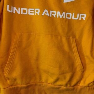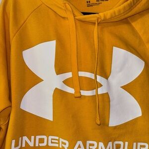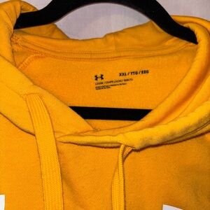 Bright yellow hoodie by Under Armour. Features a bold white logo and drawstring hood.