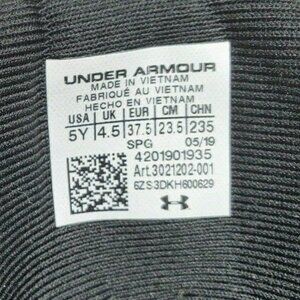 Step up their game with these Under Armour embroidered black and white youth cleated sneakers, U.S. size 5Y. Designed for performance, these shoes feature a durable cleated sole and bold style for young athletes. Please note: a minor Sharpie marking is present on the bottom (see photo), but it is barely visible and does not affect performance. Model: ART3021202-001, SPG 05/19.