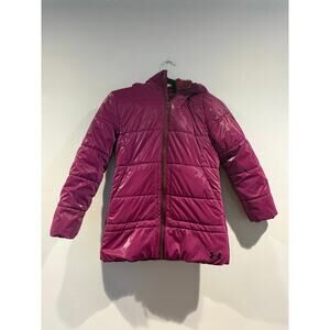 Stay warm and stylish with this Under Armour girls’ puffer jacket in a bold magenta color. Features a quilted, water-resistant exterior with cozy faux-fur interior lining for added warmth and comfort. Full-zip front with a high collar and attached hood. Signature Under Armour logo at the lower hem.
