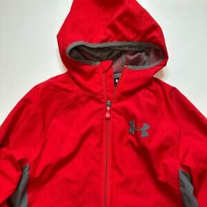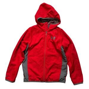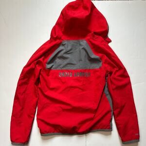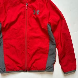 Great jacket for a young athlete! This is an Under Armour full-zip windbreaker in a vibrant red color with gray contrast panels on the sides, under the arms, and on the lower back. The large white Under Armour logo on the chest and smaller logo on the back neck stand out clearly.