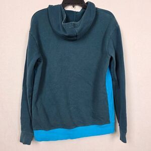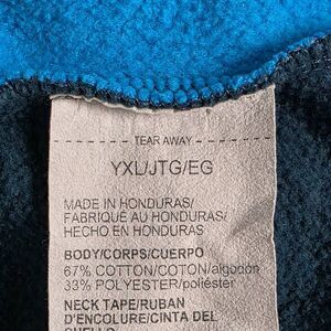 Under Armour boys' pullover hoodie in Youth XL. Two-tone blue design with UA camo logo, soft fleece interior, kangaroo pocket, and ribbed cuffs/hem. 67% cotton / 33% polyester. Loose fit. Pre-owned with light wear but no stains or holes. Warm everyday athletic layer.