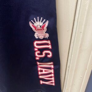 This under armor track pants come in a solid, deep, navy blue color and feature a slim close fitting silhouette designed for athletic performance. They include a comfortable elastic way and are made from a stretch of fabric that allows for ease of movement. US Navy logo on leg