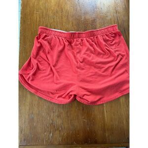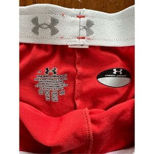 Women's under armour size extra small shorts, athletic shorts, polyester and elastic,orangish red color, waist is 14 inches, rise 9 1/2 inches, in seam is 3 inches