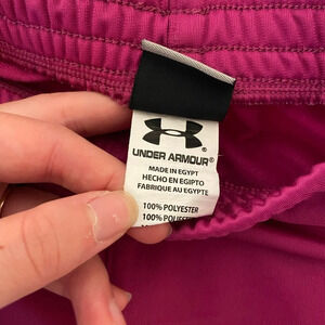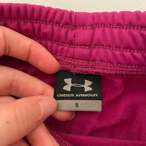 Girl’s Under Armour sweatpants. Sweatpants are dark pink in color with white stripes down the sides. Waistband is elastic & allow for easy pull on. Size small. Smoke free home!