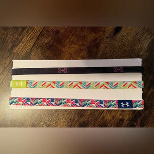 Under Armour girls/women’s headband set of 3. 3 headbands, (1) hot pink, royal blue, green & white with blue Under Armour logo tag. (1) grayish/black with purple Under Armour logo on it. (1) lime green, orange, teal blue with lime green Under Armour tag. You get all 3. Great for sports, exercise, running. Brand new. NWOT