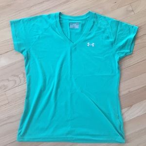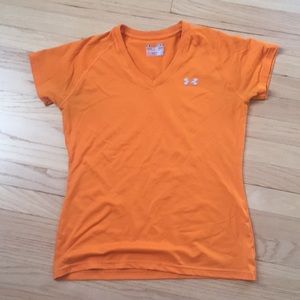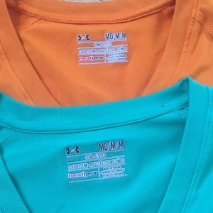 Under Armour heat gear semi-fitted workout tee shirts size medium. One is a green color (can’t tell true color by picture, but it’s green) and one is orange. Perfect condition!