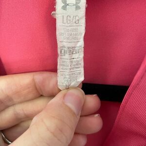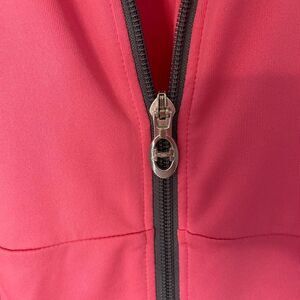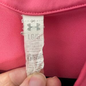 Under Armour ladies watermelon pink full zipper jacket size large. Two front pockets. Logo on back of neck is cracking and small spot on the back.