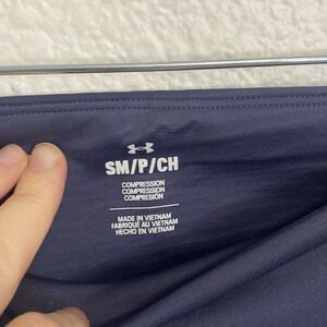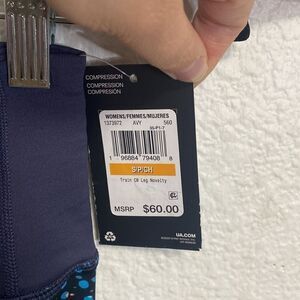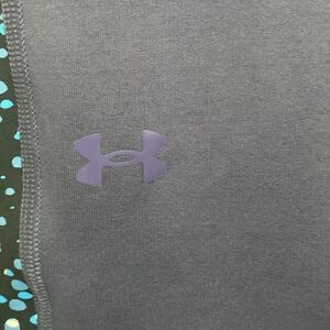 Under Armour women’s small compression high-rise full length legging new with tags Has side pockets, purple with a black blue and orange design on the sides of both legs