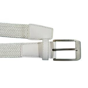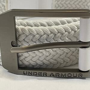 Under Armour men's golf belt in braided elastic material with metal buckle with Under Armour logo. The belt has leather pieces on the tip of the belt and at the buckle end. NWOT