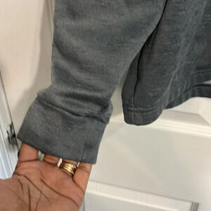 Under Armour men’s large loose pullover with 1/4 zip in gray. White spot on the front. Back logo fading. Thread missing on front upper seam. (See pics). Preloved.