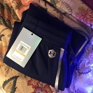 Under Armour athlete recovery sweat pants, navy blue with reflective silver outseam stripe.