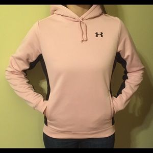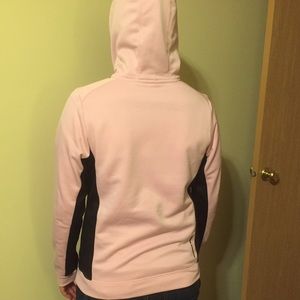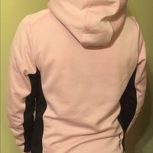 Under Armour pink hoodie with black sides. Label says medium but fits like a small. Worn 1-2 times.