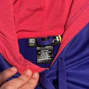 Purple and pink under armour hoodie tag says md loose. polyester. Very comfy and warm bright colors. In my opinion I feel like this is more of a teen/juniors fit but to me it seems a bit snug (however I do wear a large/xl in hoodies)