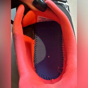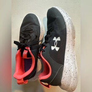 Under Armour running shoes in black and pink with paint splatter bottoms. Size 8. Great condition except insoles are missing and wear on right ankle— see picture.