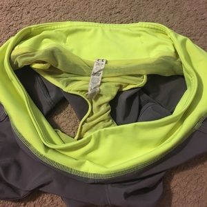 Super comfy women's Under Armour running shorts! Heat gear. Size small. Gray and highlighter yellow. Fold over pocket in small of back. Inner liner/brief is a nylon/netting kind of material and intact. Inner liner has some color transfer from washing another garment, but overall doesn't impact outside look of short. Washed and hang dried always. Smoke free home. Only selling due to downsizing and updating wardrobe.